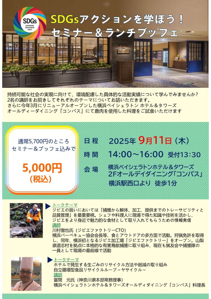 さらに今年3月にリニューアルオープンした横浜ベイシェラトン ホテル&タワーズ・オールディーダイニング「コンパス」にて鹿肉を使用した料理をご試食いただける大変お得なイベントとなります。